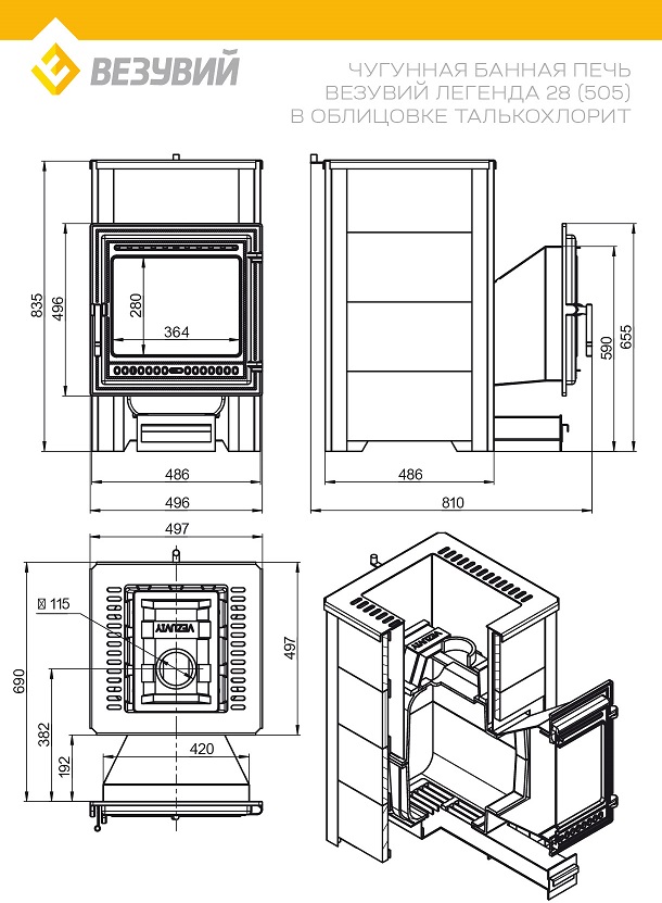 Печь ВЕЗУВИЙ Легенда 28 (505) талькохлорит диаметр дымохода: 115 мм