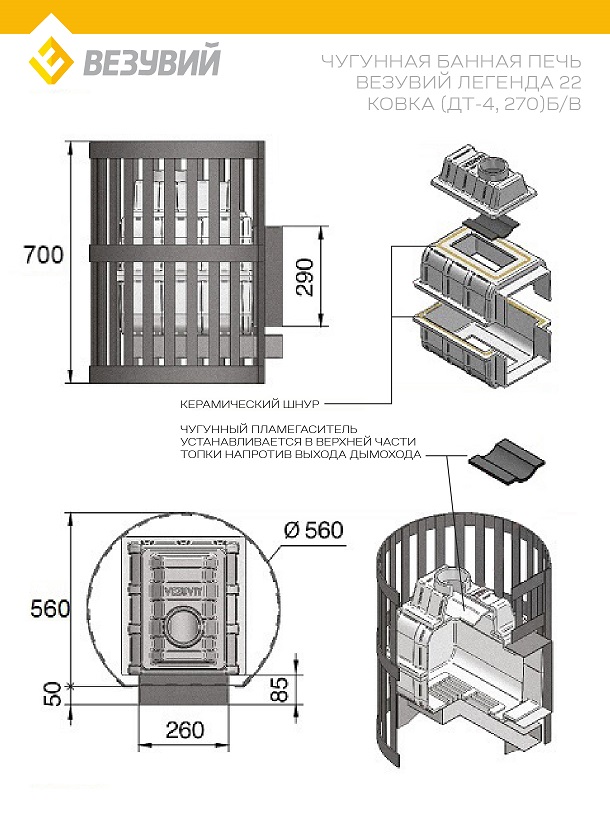 Печь ВЕЗУВИЙ Легенда Ковка 22 (270) б/в диаметр дымохода: 115 мм