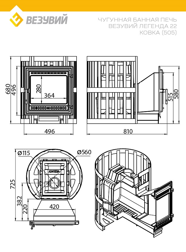 Печь ВЕЗУВИЙ Легенда Ковка 22 (505) диаметр дымохода: 115 мм