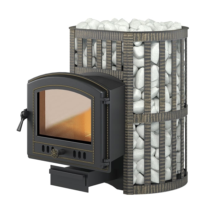 Печь ЛЕГЕНДА Ковка 28 (224) укомплектована чугунной герметичной, самоохлаждаемой дверцей с жаропрочным стеклом «SHOT ROBAX», с оборудованной системой самоочистки, и кованным конвекционно-вентилируемый кужухом. Конвекционно-вентилируемый кожух "Ковка" изготовлен из металлической текстурированной полосы покрашенной термостойкой краской и покрытая патиной «Бронза».Печь-сетка с большой загрузкой камней, выносная топка позволяет протапливать печь из соседнего с парной помещения. Большая масса камней позволяет надолго сохранять тепло после угасания огня в топке печи, также камни экранируют инфракрасное излучение исходящее от раскаленной топки печи.