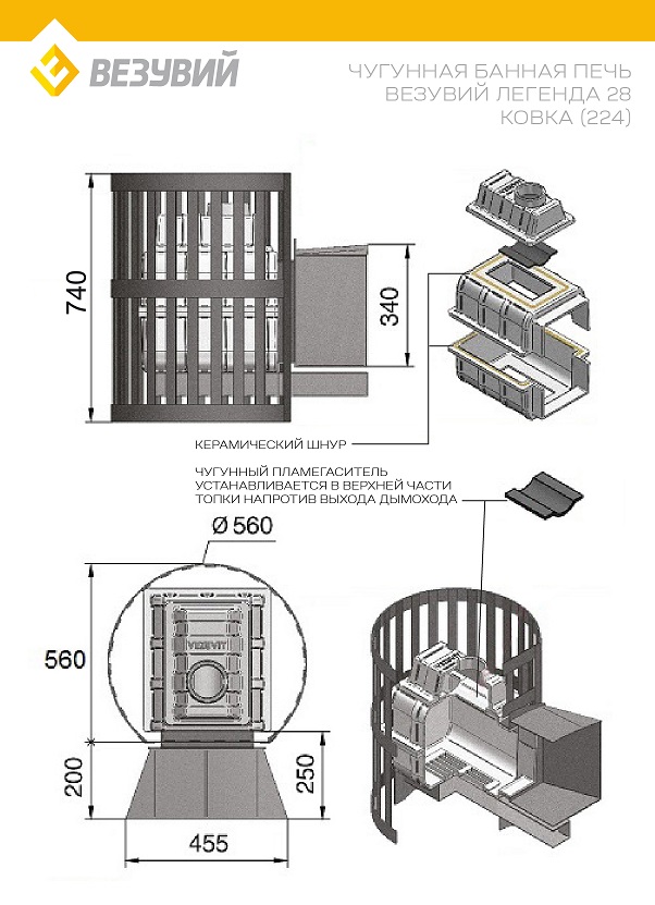 Печь ВЕЗУВИЙ Легенда Ковка 28 (224) диаметр дымохода: 115 мм
