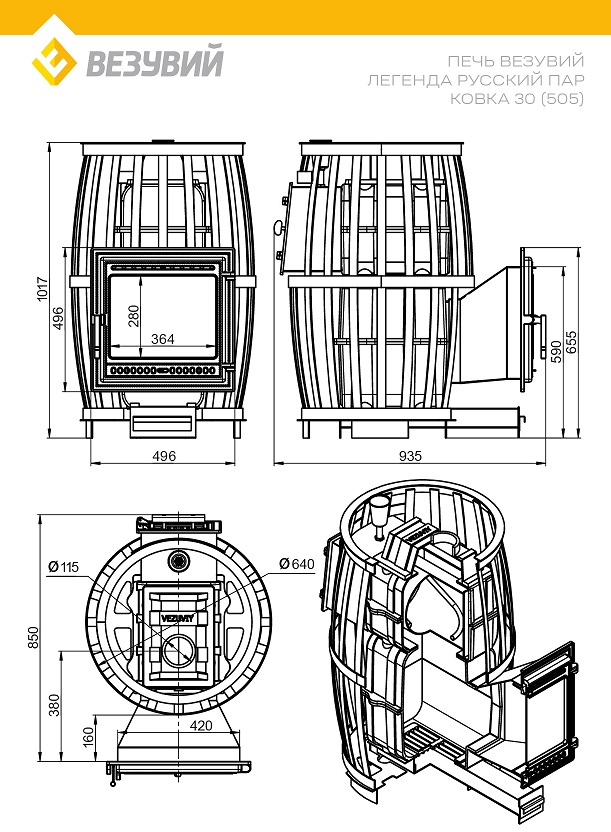 Печь ВЕЗУВИЙ Легенда Русский пар Ковка 30 (505) диаметр дымохода: 115 мм