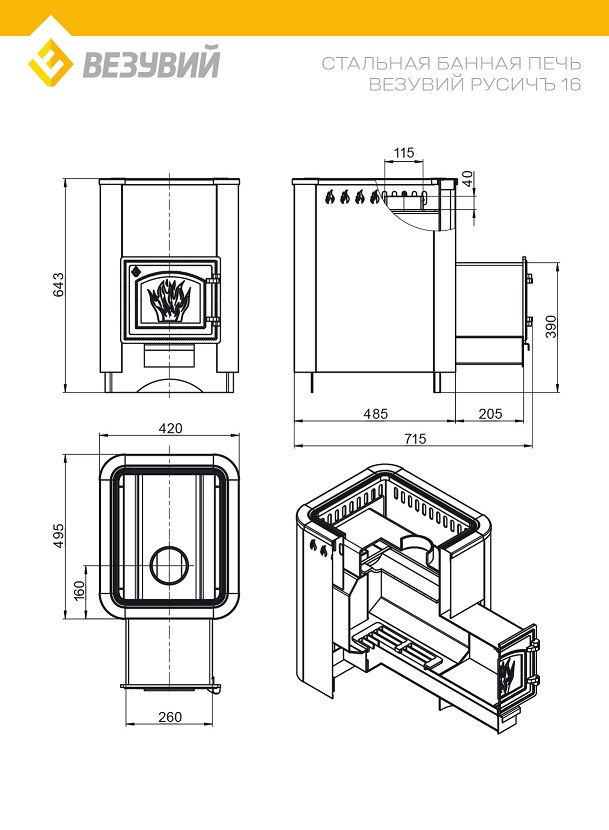 Конвекционная банная печь ВЕЗУВИЙ Русичъ Антрацит 16 (ДТ-3) изготовлена из особо прочной котловой стали марки 09Г2С толщиной 4-6 мм и может устанавливаться в парную объёмом от 8 до 18 кубических метров.