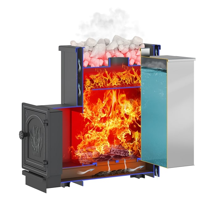 Конструкция топки позволяет максимально использовать энергию горения дров и нагревать воду без ущерба для парообразования.