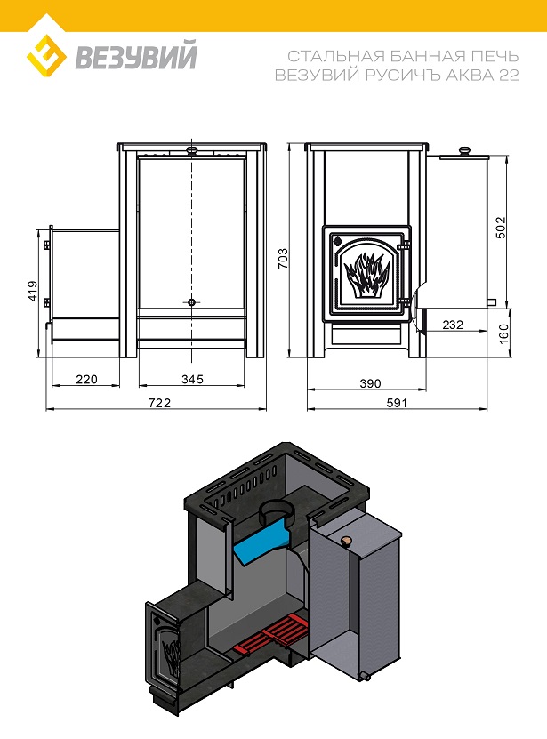 ВЕЗУВИЙ Русичъ «АКВА» 22 (ДТ-4) – стальная банная печь с баком для нагрева воды. Конструкция печи позволяет нагревать и использовать воду прямо во время парения.