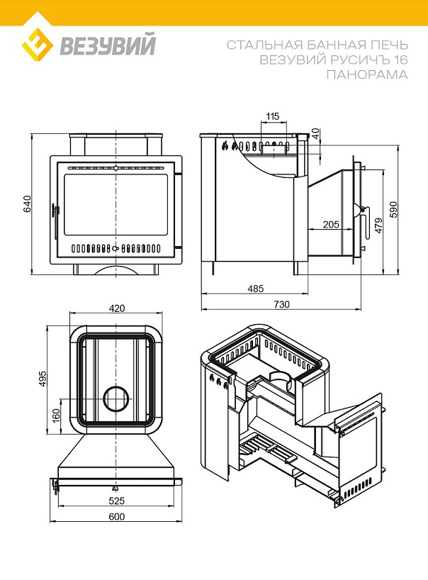 Печь ВЕЗУВИЙ Русичъ Антрацит 16 Панорама М диаметр дымохода: 115 мм