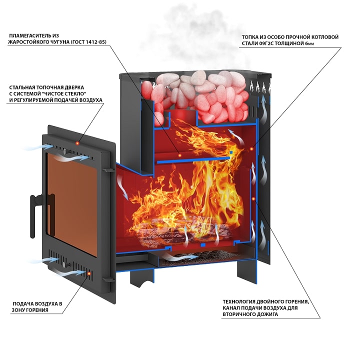 Канал для подачи вторичного дожига расположен на задней поверхности топки и проходит снизу, из поддувала, вверх, в дымосборник. Он существенно усиливает горение в верхней части печи и повышает количество получаемого от топлива энергии.
