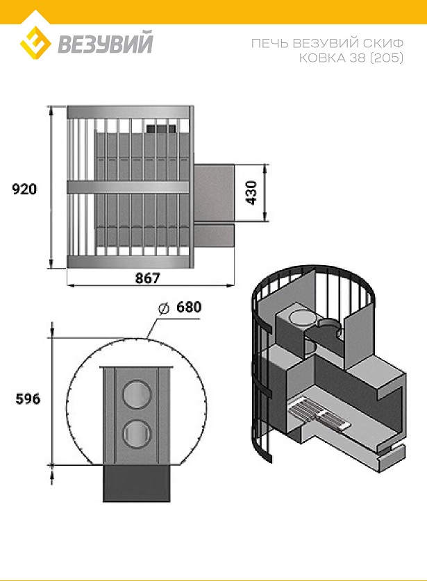 Банная печь «Везувий Скиф Ковка 38» (205) укомплектована чугунной герметичной самоохлаждаемой дверцей с жаропрочным стеклом, с оборудованной системой самоочистки, а также имеет кованый конвекционно-вентилируемый кожух (сетку). Печь рассчитана на объем парильного помещения