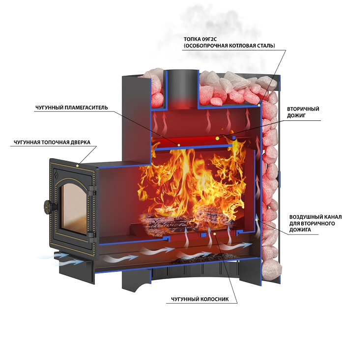 - Конвекционно-вентилируемый кожух, вмещающий до 130 кг камней;
