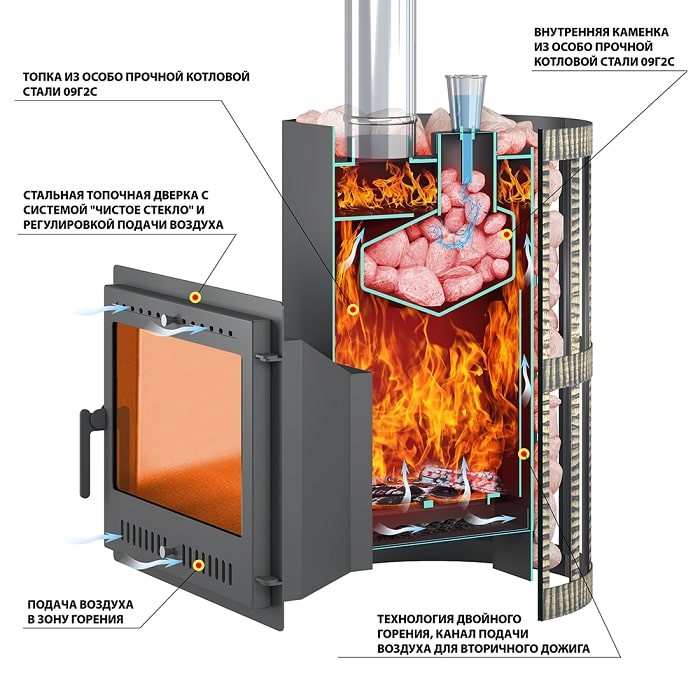 Печь Скиф устроена таким образом, что при заполнении сетки пар, получаемый в закрытой каменке, перегревается дважды: в самой закрытой каменке и после выхода, на камнях, размещённых в открытой части каменки.