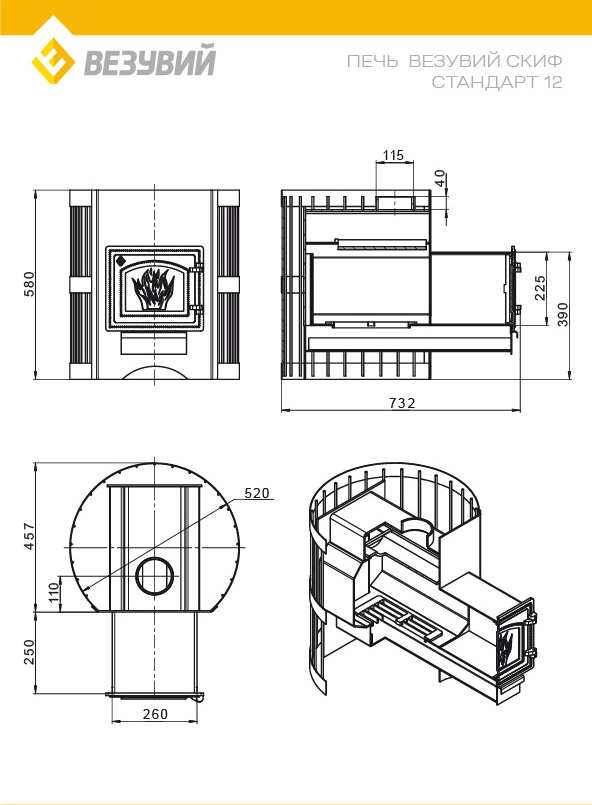 Печь ВЕЗУВИЙ Скиф Стандарт 12 (ДТ-3С) диаметр дымохода: 115 мм