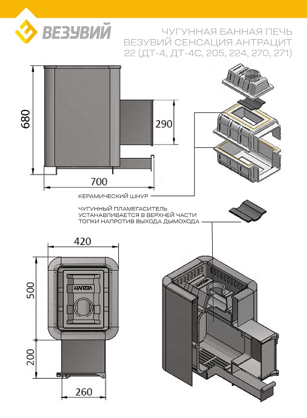 Банная чугунная печь Сенсация 22 (ДТ-4) укомплектована чугунной не герметичной дверцей Везувий ДТ-4. Объемная, вентилируемая каменка позволяющая максимально быстро нагреть камни с четырёх сторон в кратчайшие сроки, что значительно ускоряет нагревание воздуха в парилке за счёт образуемого им мощного конвекционного потока.