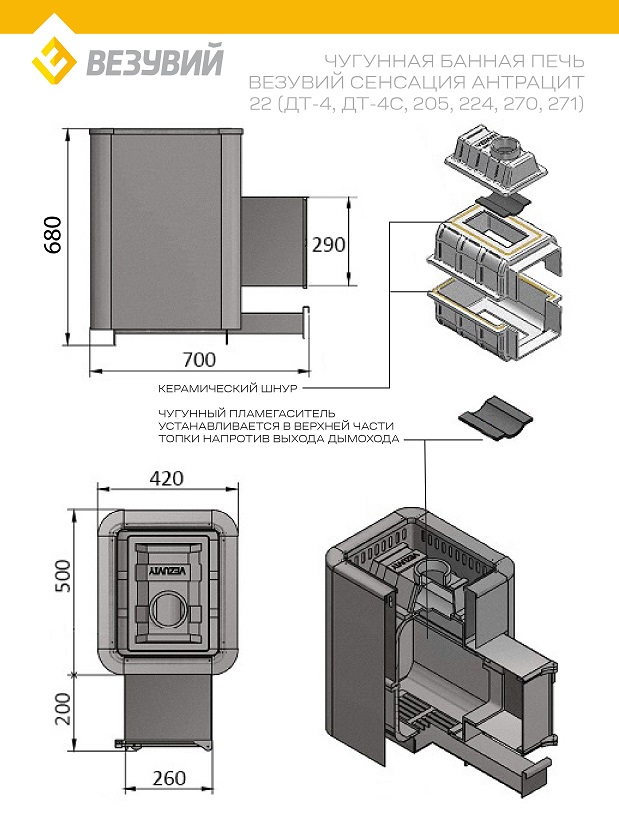 Преимущество печи в том, что топка печи состоит из 3-х элементов. На стыке между ними используется керамический шнур с рабочей температурой 1200 градусов. То есть топка печи абсолютно герметична! Для фиксации деталей между собой применяется болтовое соединение, что даёт 100% гарантию безопасности при эксплуатации.Банная чугунная печь Сенсация 22 (ДТ-4С) укомплектована чугунной не герметичной дверцей Везувий ДТ-4С.