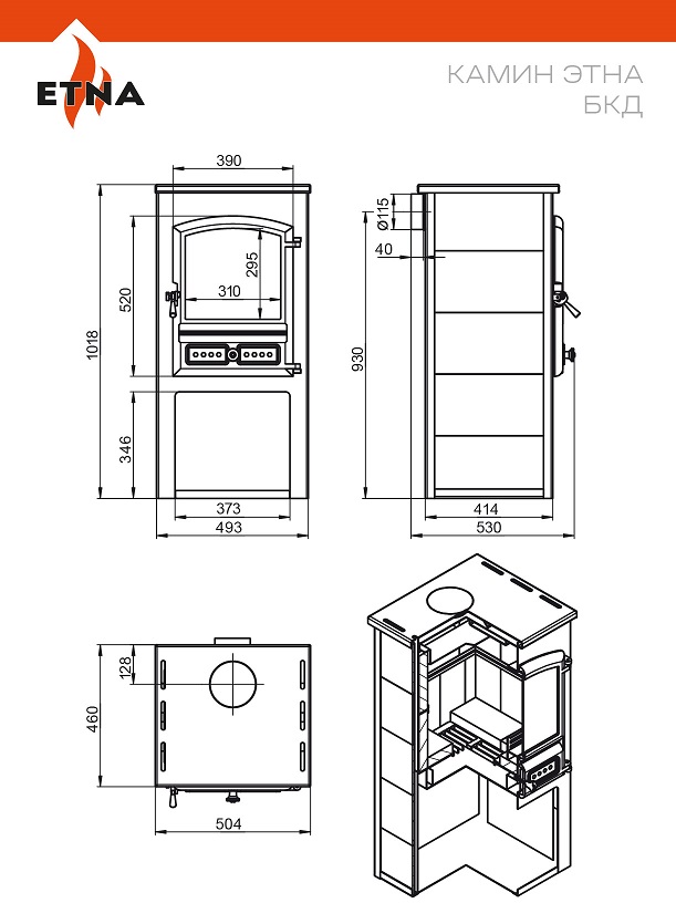 Печь-камин ЭТНА предназначена для обогрева помещений объемом от 50 до 180 м3 за счёт горения твёрдого топлива (дрова, топливные брикеты).Печь-камин комплектуется чугунной дверкой с остеклением БКД и чугунной плитой на верхней поверхности печи, дополненной съёмными конфорками.