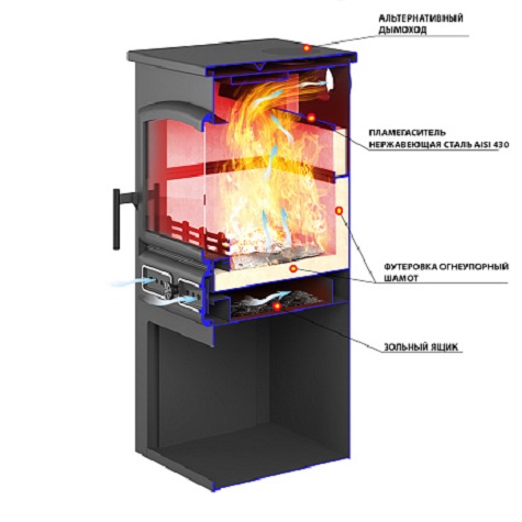 Печь-камин включает в свою конструкцию топочную камеру с поддувалом и дымосборником, а также дополнительные боковые стенки, облицованные керамическими плитками чёрного или бежевого цвета. При этом топка располагается в верхней части печи-камина, а нижняя свободная часть может быть использована в качестве дровника.
