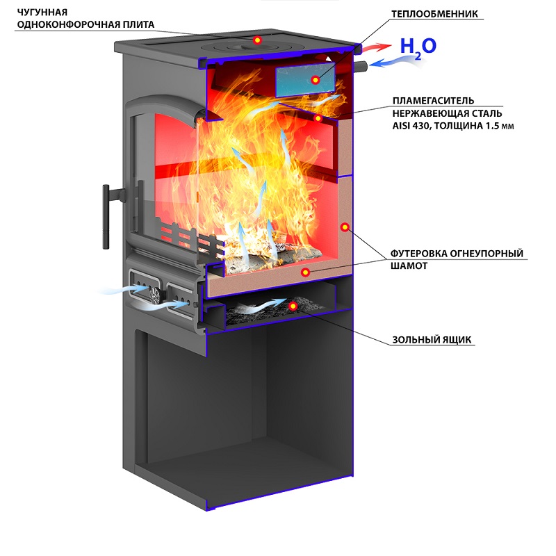 Чугунная плита на верхней поверхности печи-камина позволяет во время топки готовить или разогревать еду. Большая площадь плиты и её высокая теплоёмкость также помогают ускорить прогрев помещения. Конфорки плиты съёмные, что облегчает установку и прогрев посуды во время работы печи-камина. Задний выход патрубка дымохода увеличивает полезную площадь верха плиты, на которую можно устанавливать посуду большого размера.