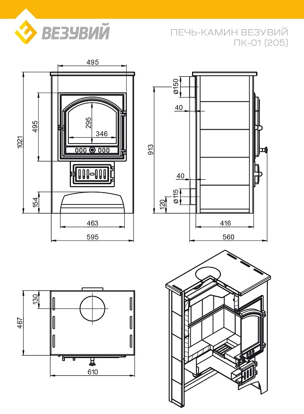 - Диаметр дымохода: 150 мм
