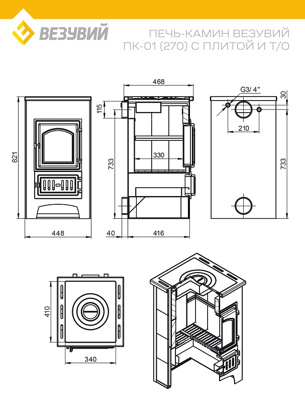 Печь-Камин ВЕЗУВИЙ ПК-01 (270) изготовлена из высококачественной конструкционной стали , предназначена для отопления жилых и подсобных помещений до 150 м³. Конвекционно–вентилируемая облицовка, изготовленная из экологически чистой керамической плитки, обладающей большой теплоёмкостью, что позволяет в короткие сроки нагреваться и максимально долго удерживать стабильную температуру. Плитка хорошо поглощает влагу, а при пересушенном воздухе напротив ее отдает , что позволяет поддерживать комфортную атмосферу в помещении. Печь оснащена чугунной дверцей с жаростойким стеклом и регулировкой режимов горения. Чугунная колосниковая решетка при нагревании не деформируется и обеспечивает отличный приток воздуха в топочную камеру. Чугунная варочная плита позволит без труда приготовить пищу. Встроенный теплообменник позволит без проблем подключить печь к отопительной системе помещения.
