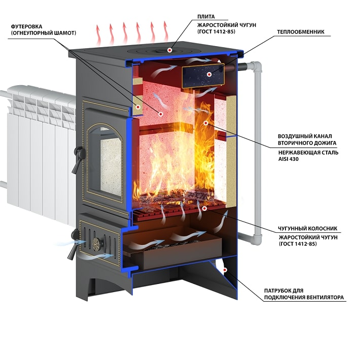 Топочная камера, футерована легкозаменяемым высококачественным шамотом, прогревается дольше обычной чугунной топки ,но теплоотдача гораздо больше. Шамот предохраняет стенки печи от перегревания, тем самым увеличивает срок службы печи. Зуб отбойник из нержавеющей стали, толщиной 2 мм, препятствует "опрокидыванию тяги" , что обеспечивает надежную тягу при любых погодных условиях. Длительность горения одной закладки дров - до 5 часов.