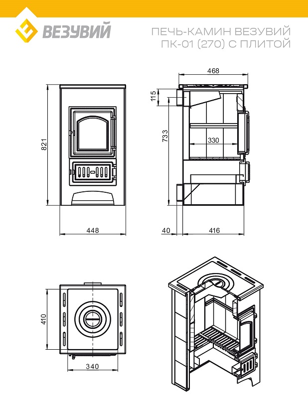 Печь-Камин ВЕЗУВИЙ ПК-01 (270) с плитой красн. 9 кВт (150 м3) Ø 115 мм диаметр дымохода: 115 мм