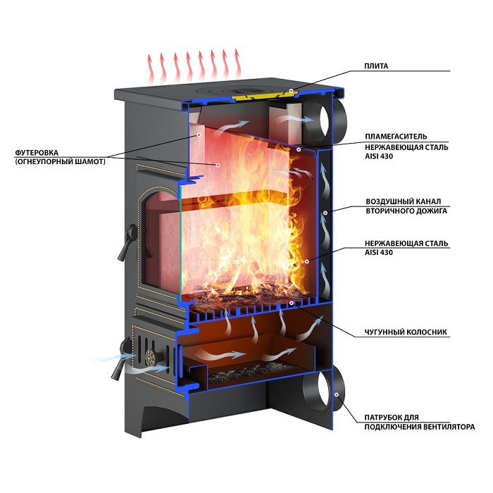 - Чугунная поддувальная дверь с системой регулировки режимов горения.