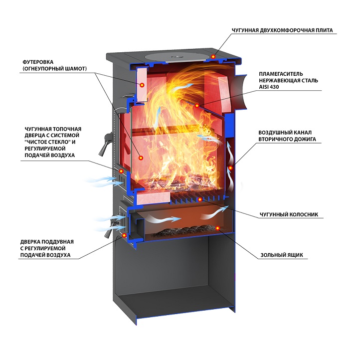 - Чугунная поддувальная дверь с системой регулировки режимов горения