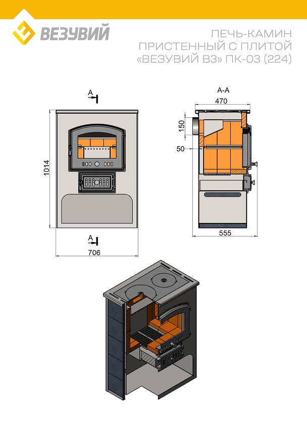 Печь-Камин ВЕЗУВИЙ ПК-03 (224) с плитой Везувий В3 талькохлорит 12 кВт (200 м3) Ø150мм диаметр дымохода: 150 мм