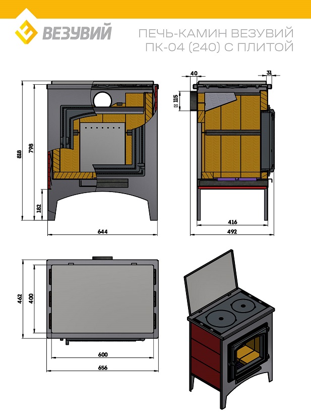 Печь-Камин ВЕЗУВИЙ ПК-04 (240) с плитой амфиболит 12 кВт (200 м3) Ø115мм диаметр дымохода: 115 мм