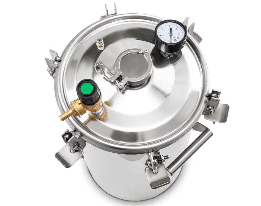 Для правильного использования в конструкцию встроен манометр для отслеживания давления, клапан сброса избыточного давления и гермоввод для электрического термометра. Кламповое соединение предназначено для установки дистиллятора и расширения возможностей вашего автоклава.