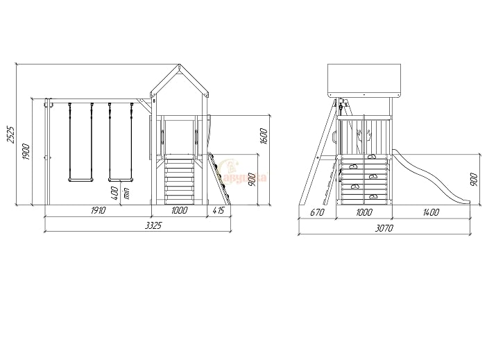 Опорные столбы из материала 45х90, качельная рама: клееный брус 70х70. Модельный ряд имеет множество возможностей по модульной кастомизации(подробности у менеджеров). Можно устанавливать горки разной длины.