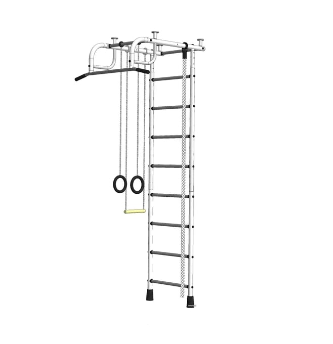 Если комната небольшая и есть желание закрепить комплекс ближе к стене, убирается закругление и на потолочные трубы со стороны стены ставятся заглушки ( идут в комплекте). В таком случае, шведская стенка отходит от стены не больше, чем у конкурентов, а вынос турника остается увеличенным, что совершенно не мешает, т.к. если ребенок не занимается, снаряды просто убираются за шведскую стенку. Вынос турника увеличен у всех ДСК с креплением враспор.