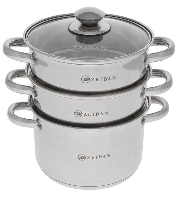 Пароварка Zeidan изготовлена из высококачественной нержавеющей стали, что делает посуду износостойкой, прочной и практичной. Зеркальная полировка придает изделию особо эстетичный внешний вид. Пароварка имеет 3 уровня: кастрюлю для бульона и две съемные решетки с отверстиями. Многослойное дно позволяет посуде быстро прогреваться и распределять тепло по всей поверхности. Крышка, выполненная из жаростойкого стекла, снабжена металлическим ободом, пароотводом и ручкой. В пароварке можно готовить, например, овощи или котлеты. Готовить на пару очень просто, продукты не пригорают и не склеиваются, а готовое блюдо выходит рассыпчатым и ароматным.Подходит для всех типов плит, кроме индукционных. Можно мыть в посудомоечной машине.