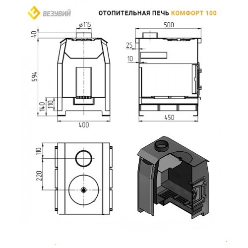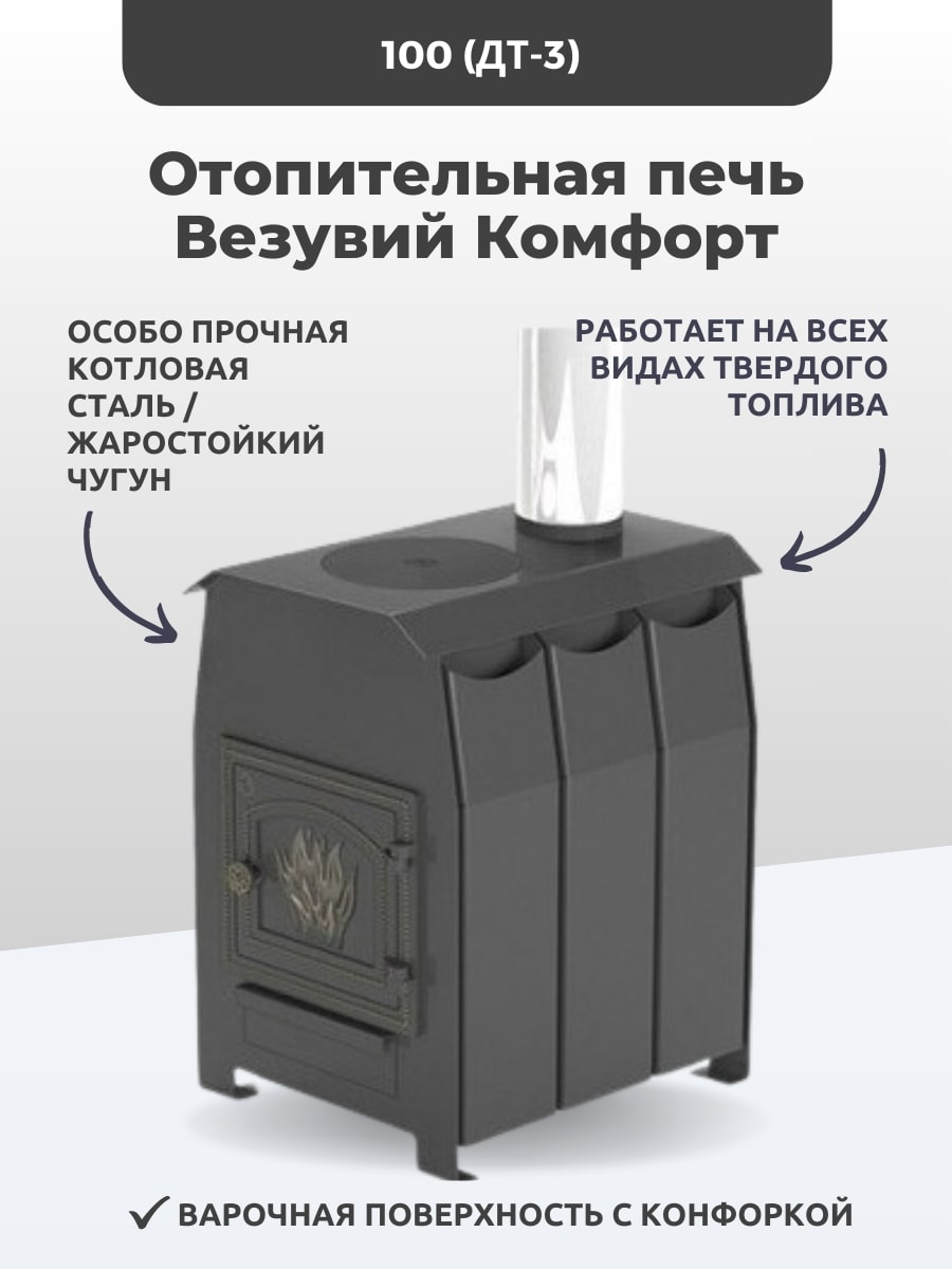 Печь Везувий "Комфорт 100" (ДТ-3) выполнена в эргономичном дизайне, компактна по своим размерам, окрашена эмалью черного цвета, что позволяет ей органично вписаться в интерьер любого помещения, долго обогревать дом, привнося в него тепло и уют.