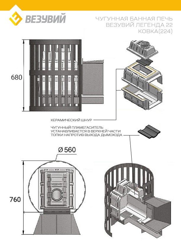 Печь ВЕЗУВИЙ Легенда Ковка 22 (224) диаметр дымохода: 115 мм