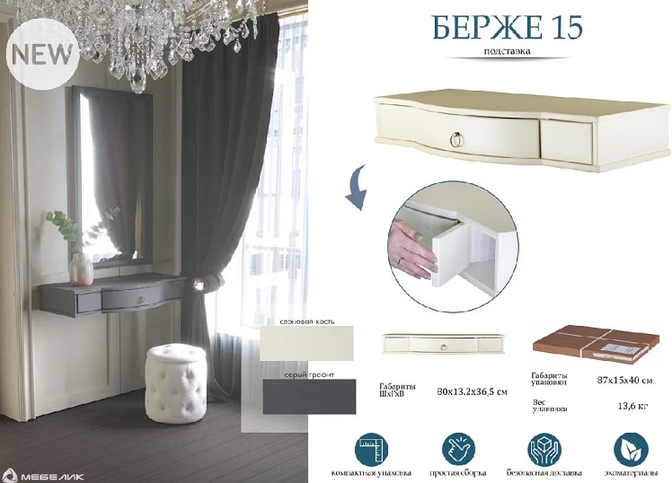 Подвесная консоль Берже 15 станет украшением спальни, гостиной, прихожей, будуара в классическом стиле.Кроме выдвижного ящика, у модели есть два потайных.