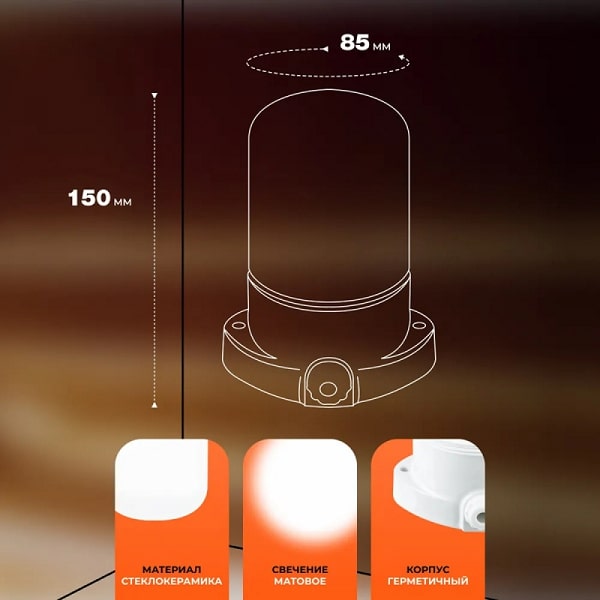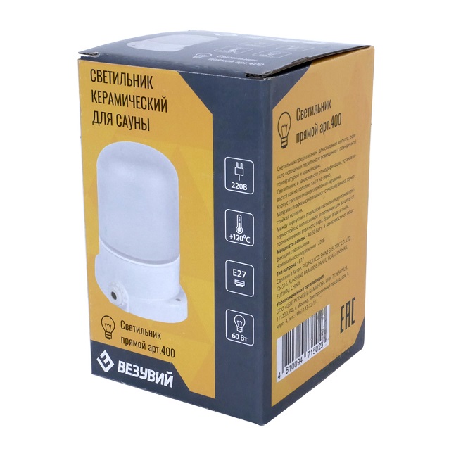 Светильник "ВЕЗУВИЙ" для сауны (арт.400) Прямой предназначен для мягкого освещения парилок с повышенной температурой и влажностью. Корпус изготовлен из керамики, плафон - матовое термостойкое стекло. Между корпусом и плафоном светильника установлено термостойкое силиконовое уплотнение для защиты от проникновения влажного пара, брызг воды и пыли.Характеристики: