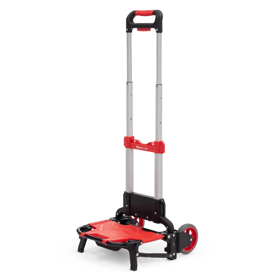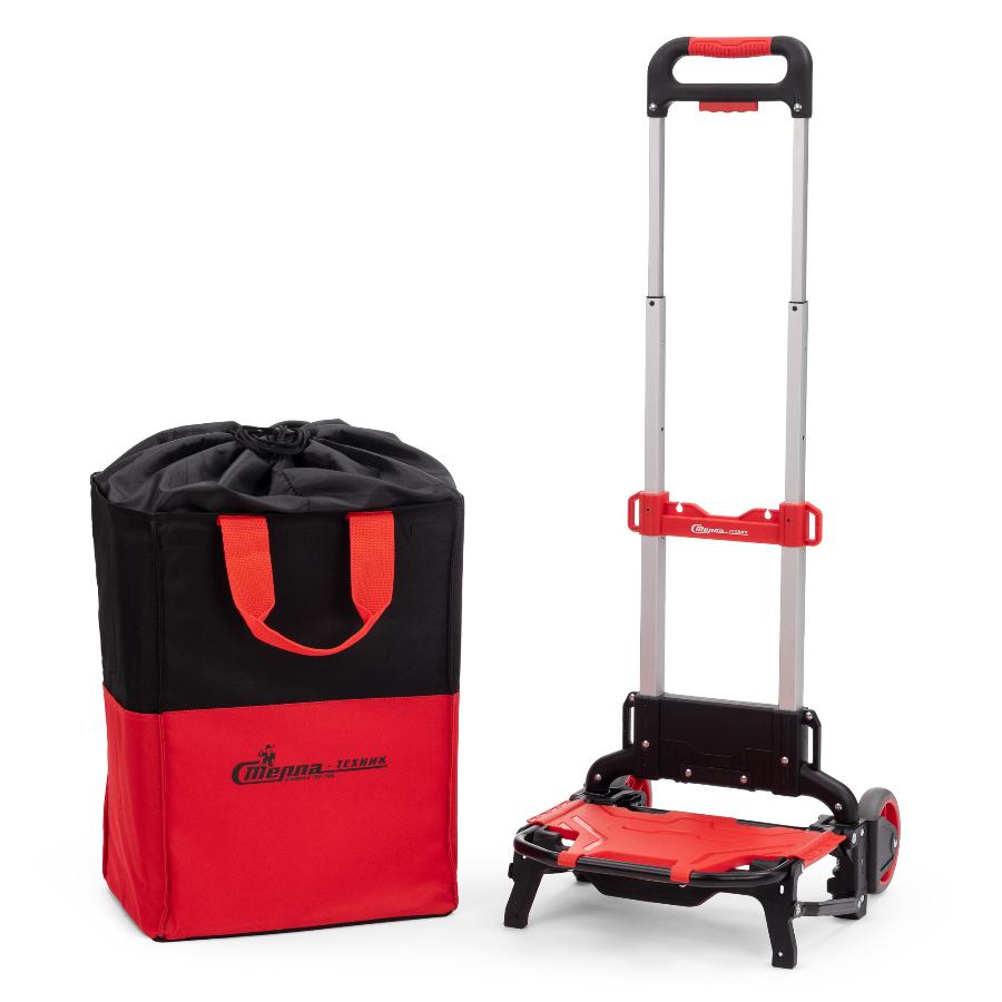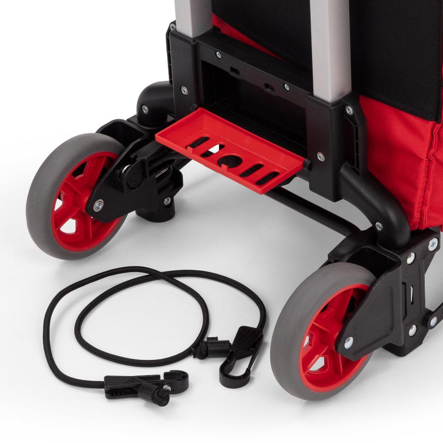 Тележка на колесах грузоподъемностью 60 кг, на которой установлена данная сумка, обеспечивает легкое и бесшумное передвижение за счет колес из литой резины диаметром 121 мм с усиленными кронштейнами. Алюминиевый корпус обеспечивает прочность и долговечность конструкции. Тележка обладает удобной складной конструкцией. За счет узкого профиля и компактных размеров технику легко разместить на полке в самолете или в багажник автомобиля. Алюминиевая телескопическая ручка раскладывается в двух положениях 900 мм и 1000 мм, а анатомический захват с накладкой из нескользящего полимера предотвратит появление мозолей и сократит мышечное напряжение. Размер площадки для размещения груза 260х350. Так же тележка комплектуется шнуром для фиксации груза, который удобно располагается на тыльной стороне тележки в специальном карман-пенале.