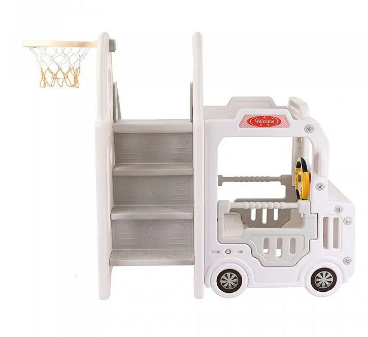 - Элементы в комплекте: Баскетбольная корзина, горка, лестница, мяч, музыкальный блок, игровая зона (машинка), насос