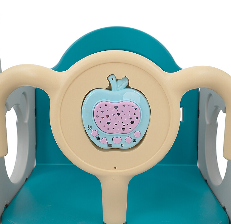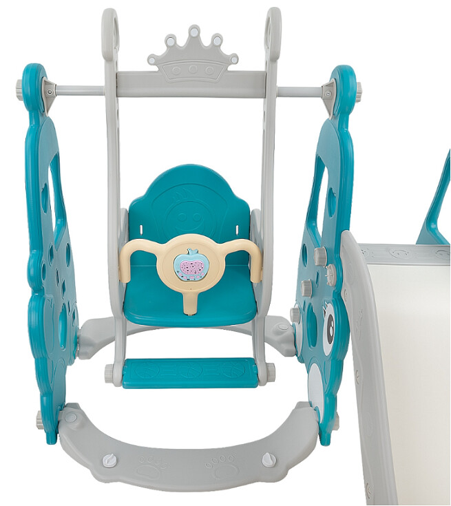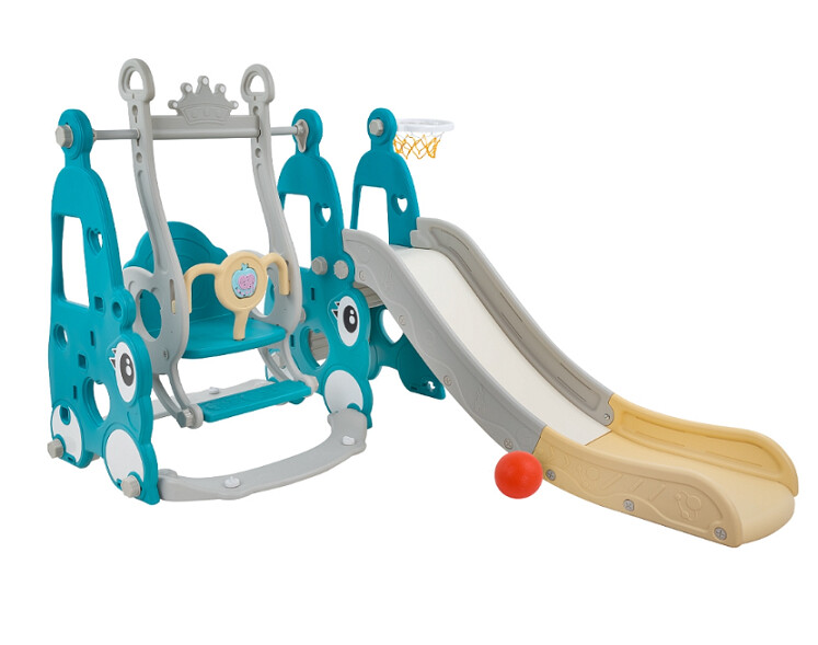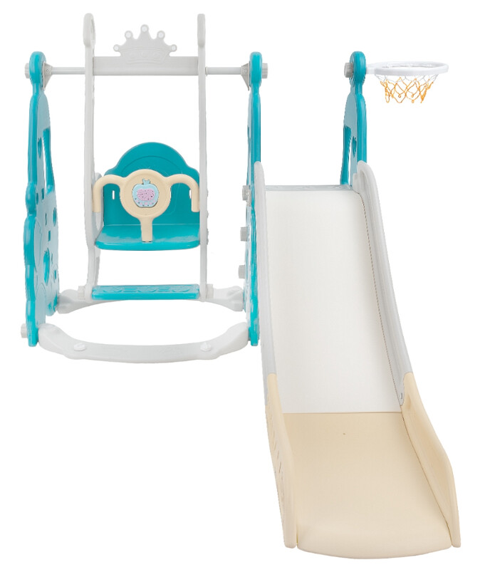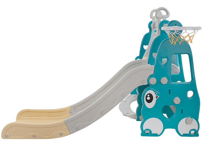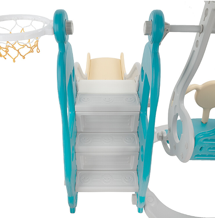 - Элементы в комплекте: Горка, качели, баскетбольная корзина, мяч, музыкальный блок, лестница