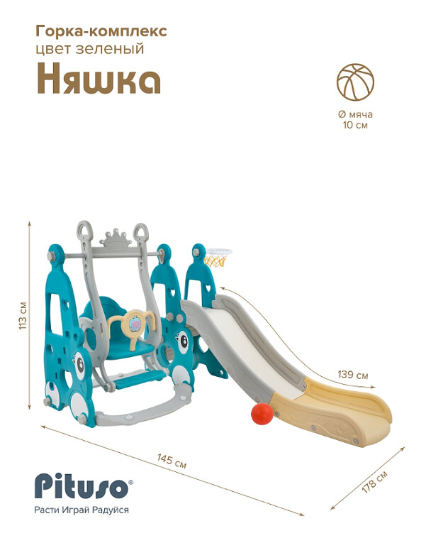Горка-комплекс Pituso Няшка YYSB965 это продуманная конструкция, ненавязчивый дизайн, возможность раздельного использования делают ее лучшим подарком. Идеально подходит для семей с несколькими детьми, в том числе разных возрастов. Пока младший счастливо качается в качелях, старший радуется на горке или забрасывает мяч в баскетбольное кольцо. А их еще и два – можно и друга пригласить поиграть!