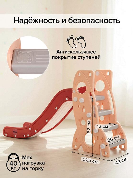 Горка Pituso— это не только веселье, но и забота о безопасности. Все элементы конструкции сделаны из безопасного и качественного пластика, который не имеет неприятного запаха и устойчив к внешним воздействиям. Инновационный дизайн включает в себя плавный спуск, широкое основание для большей устойчивости и подходит как для мальчиков, так и для девочек.