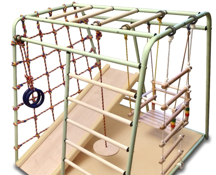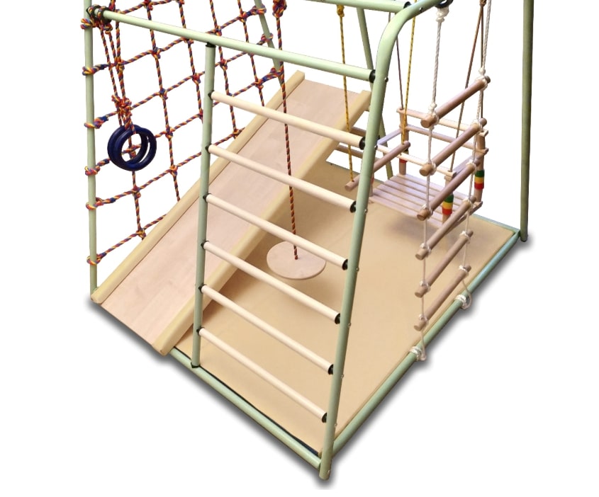 Этот детский спортивный комплекс размеры имеет идеально подходящие для среднестатистической комнаты - 1,31 х 1,07 м. Достаточно освободить угол детской от горы игрушек – и вот уже у вашего малыша есть собственный мобильный спортивный зал!