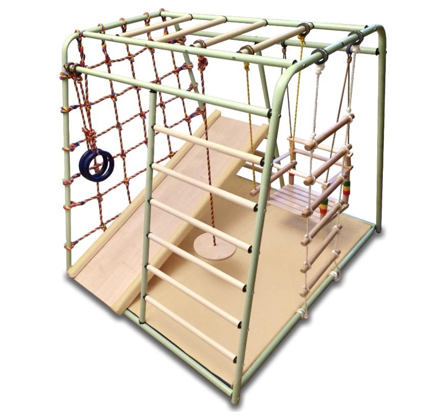 Комплектация: качели, веревочная лестница 6 ступеней, кольца гимнастические, трапеция, тарзанка, сетка-паутина, горка, мат (бежевый)