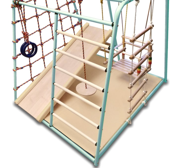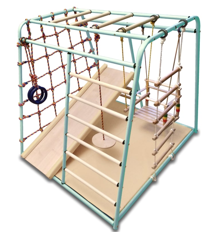 Этот детский спортивный комплекс размеры имеет идеально подходящие для среднестатистической комнаты - 1,31 х 1,07 м. Достаточно освободить угол детской от горы игрушек – и вот уже у вашего малыша есть собственный мобильный спортивный зал!