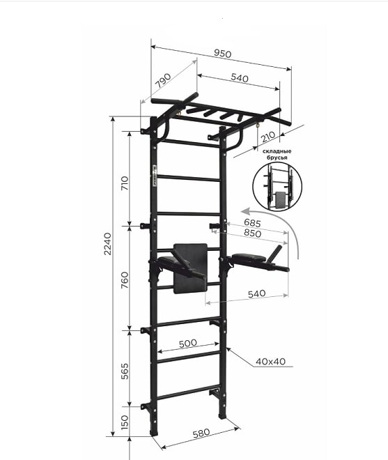 - Комплектация: турник стационарный, складные брусья со съёмной спинкой