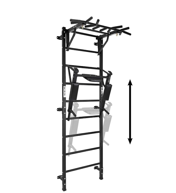 Съемный турник и съемные брусья можно фиксировать на любой перекладине шведской стенки и легко переставить на нужный уровень, что позволяет сделать комплекс удобным для людей разного роста, в том числе подростков и детей. Также возможно использование комплекса с одним навесным элементом — турником или брусьями, а при необходимости навесные элементы легко снять и использовать для занятий только шведскую стенку.