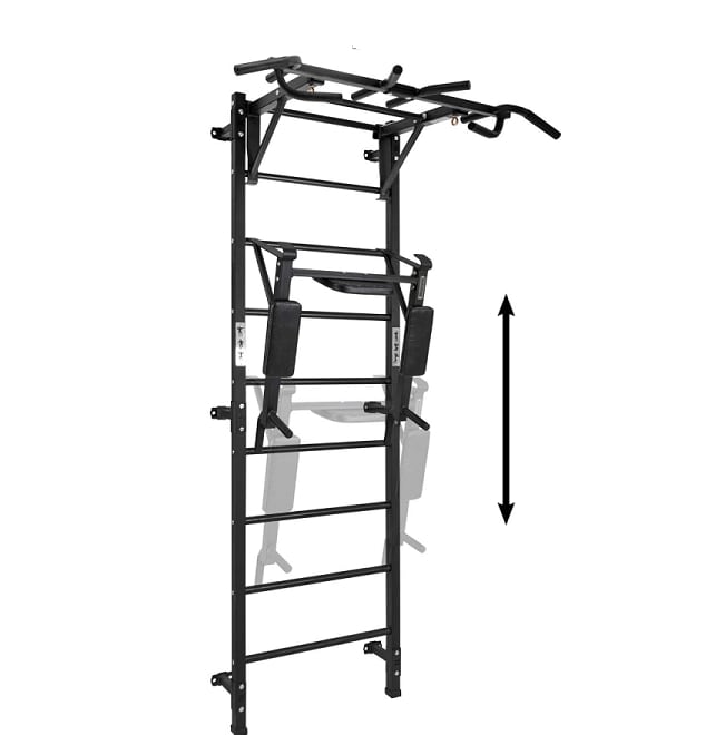 Съемный турник и съемные брусья можно фиксировать на любой перекладине шведской стенки и легко переставить на нужный уровень, что позволяет сделать комплекс удобным для людей разного роста, в том числе подростков и детей. Также возможно использование комплекса с одним навесным элементом - турником или брусьями, а при необходимости навесные элементы легко снять и использовать для занятий только шведскую стенку.