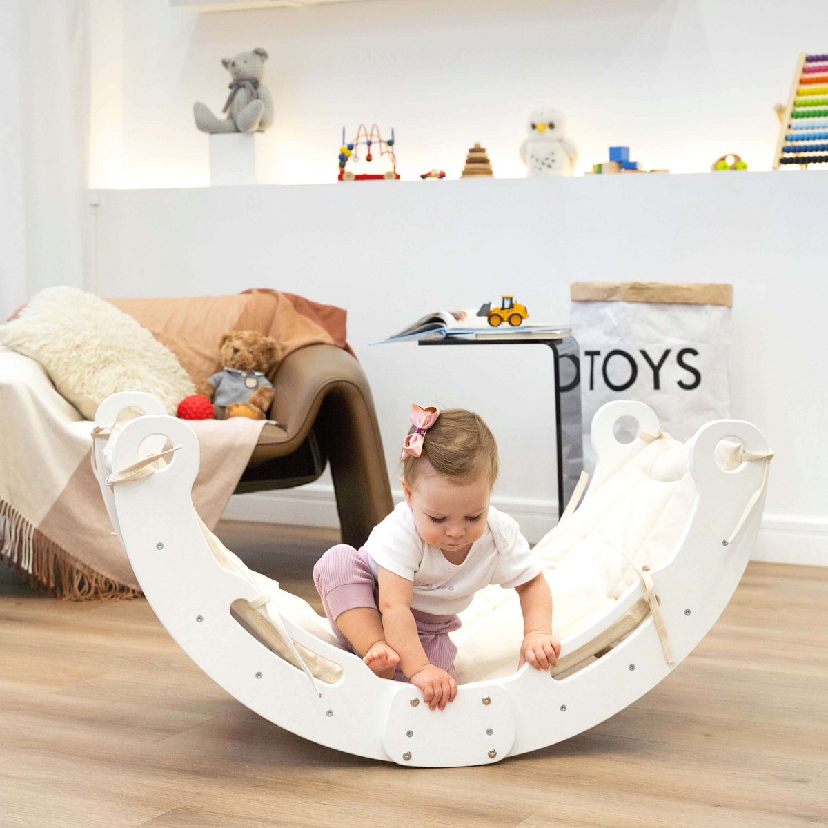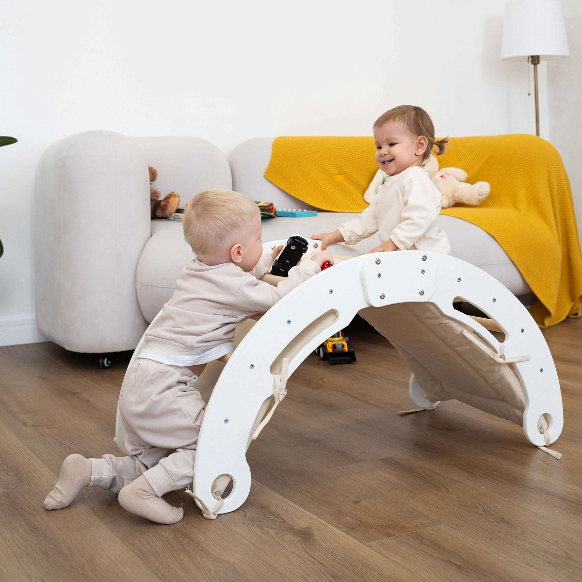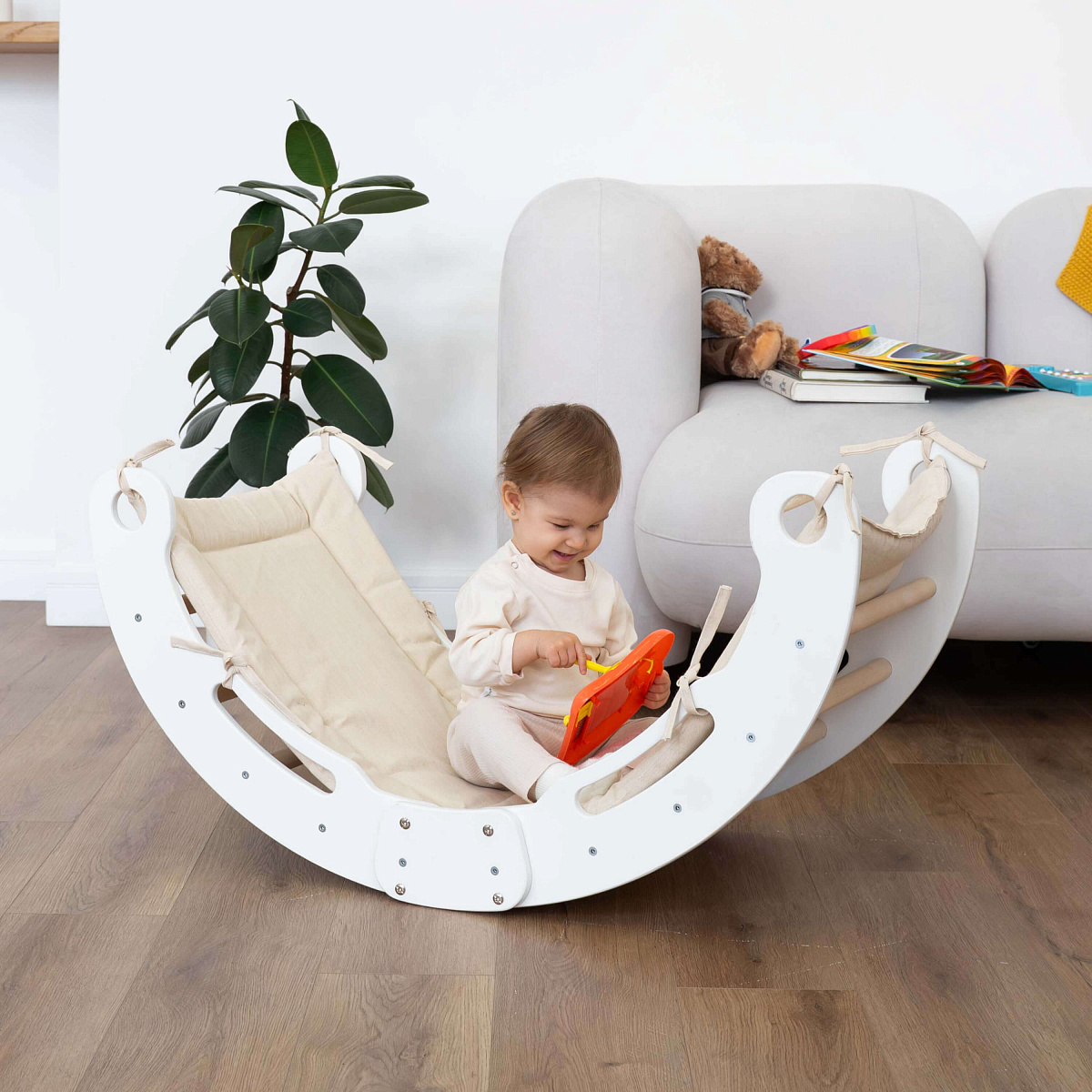 Второй способ — перевернуть арку так, чтобы она стала качелями, которые разнообразят досуг и станут любимым местом для отдыха и расслабления. Качание расслабляет, быстро успокаивает и переключает детей с активных игр на отдых.