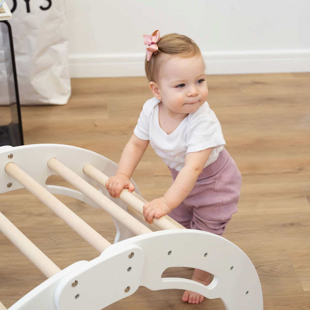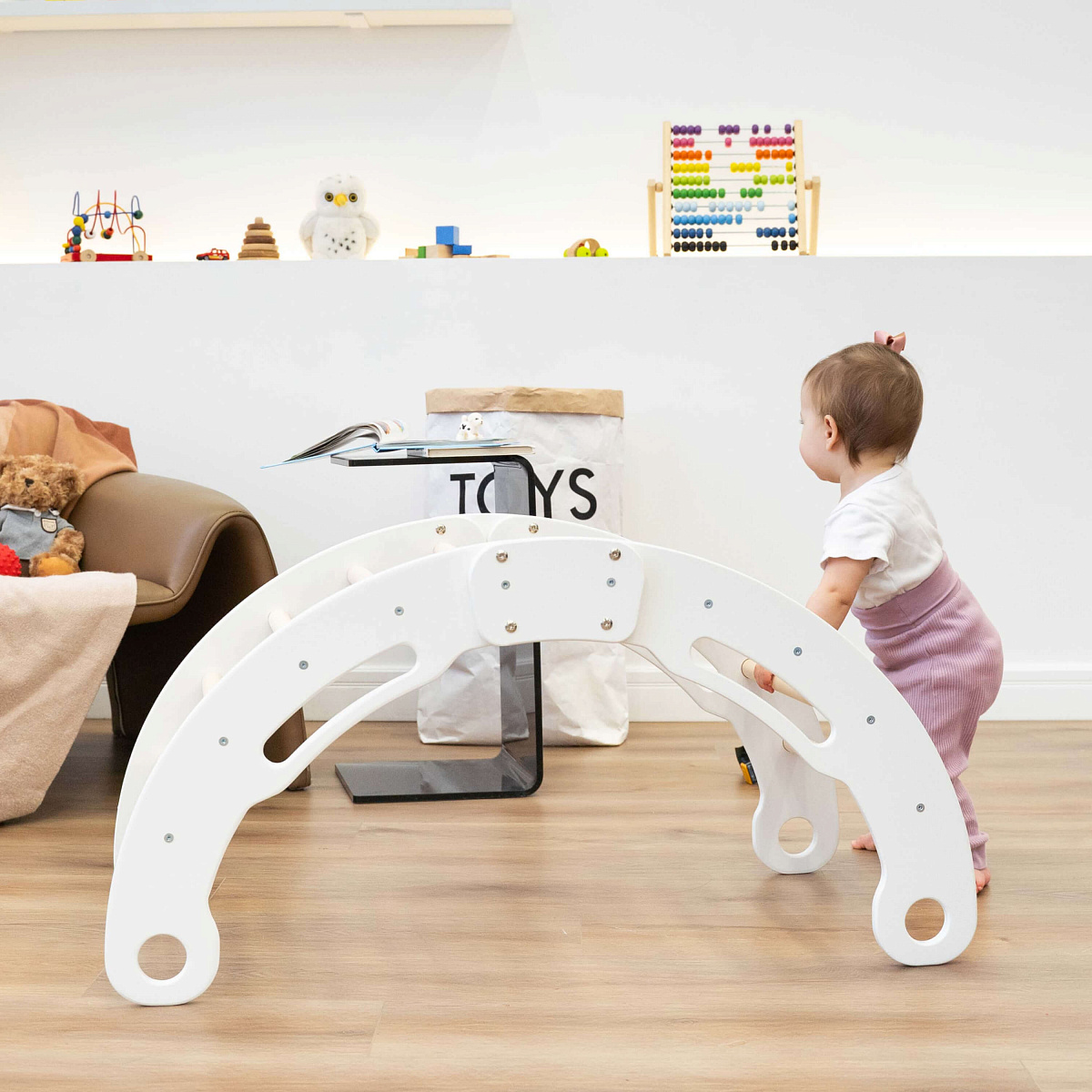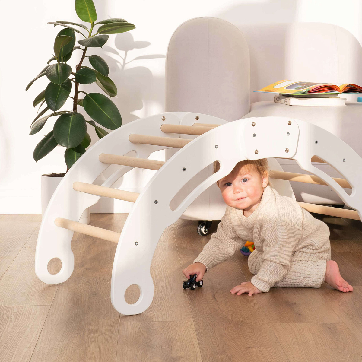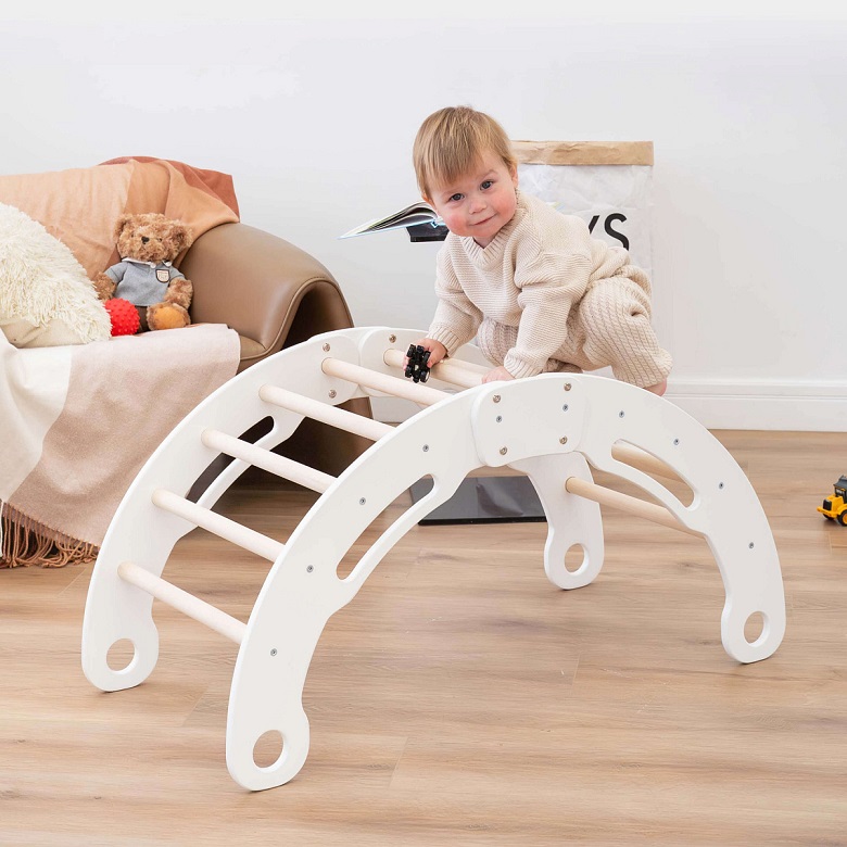 Первый способ — в качестве скалолазной дуги. Лазание развивает координацию и логическое мышление малыша, тренирует его руки и ноги, а также учит держать равновесие и планировать дальнейшие действия заранее.