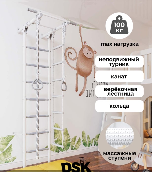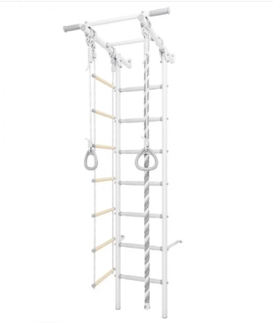Комплектация: турник неподвижный, канат, кольца гимнастические, лестница веревочная